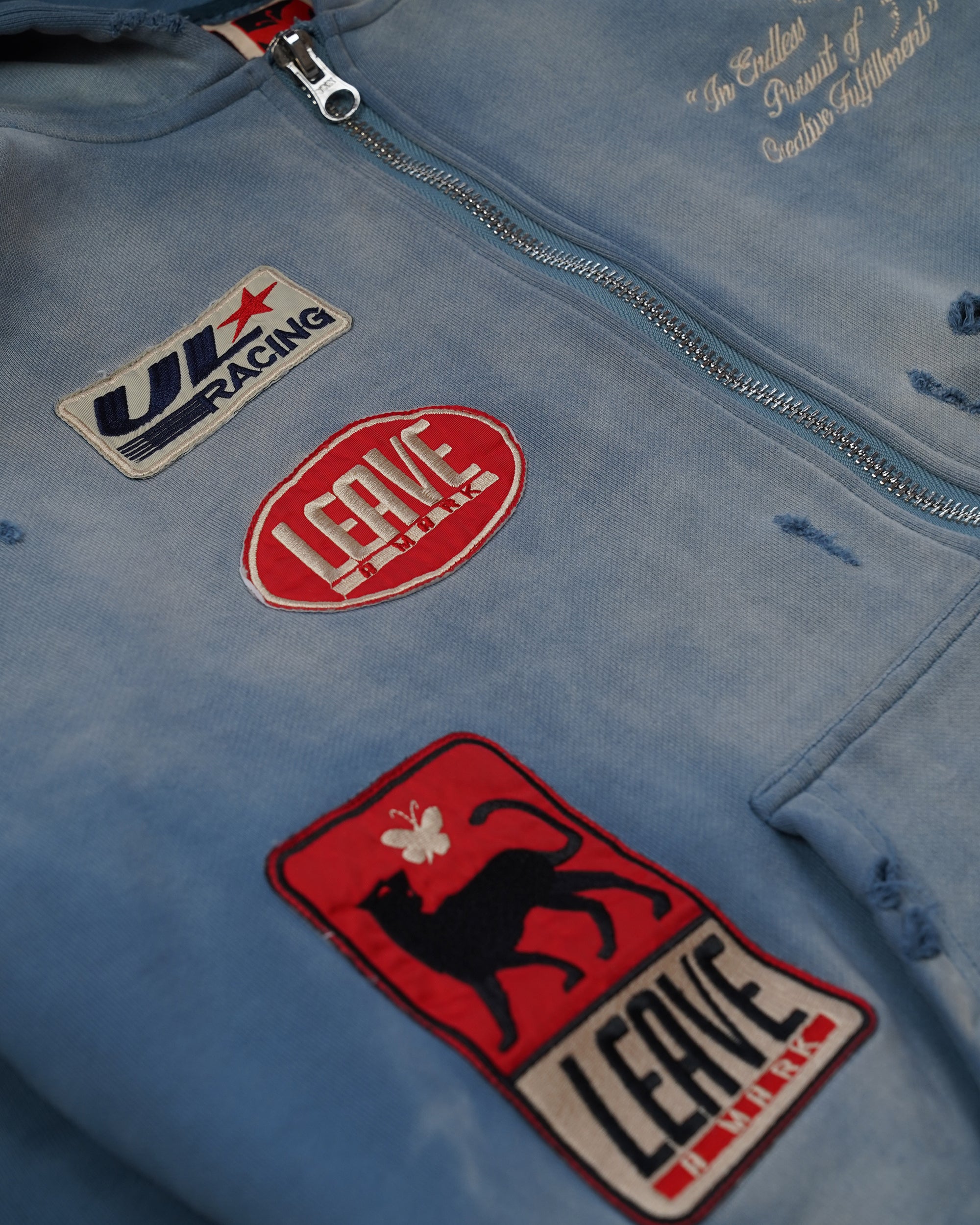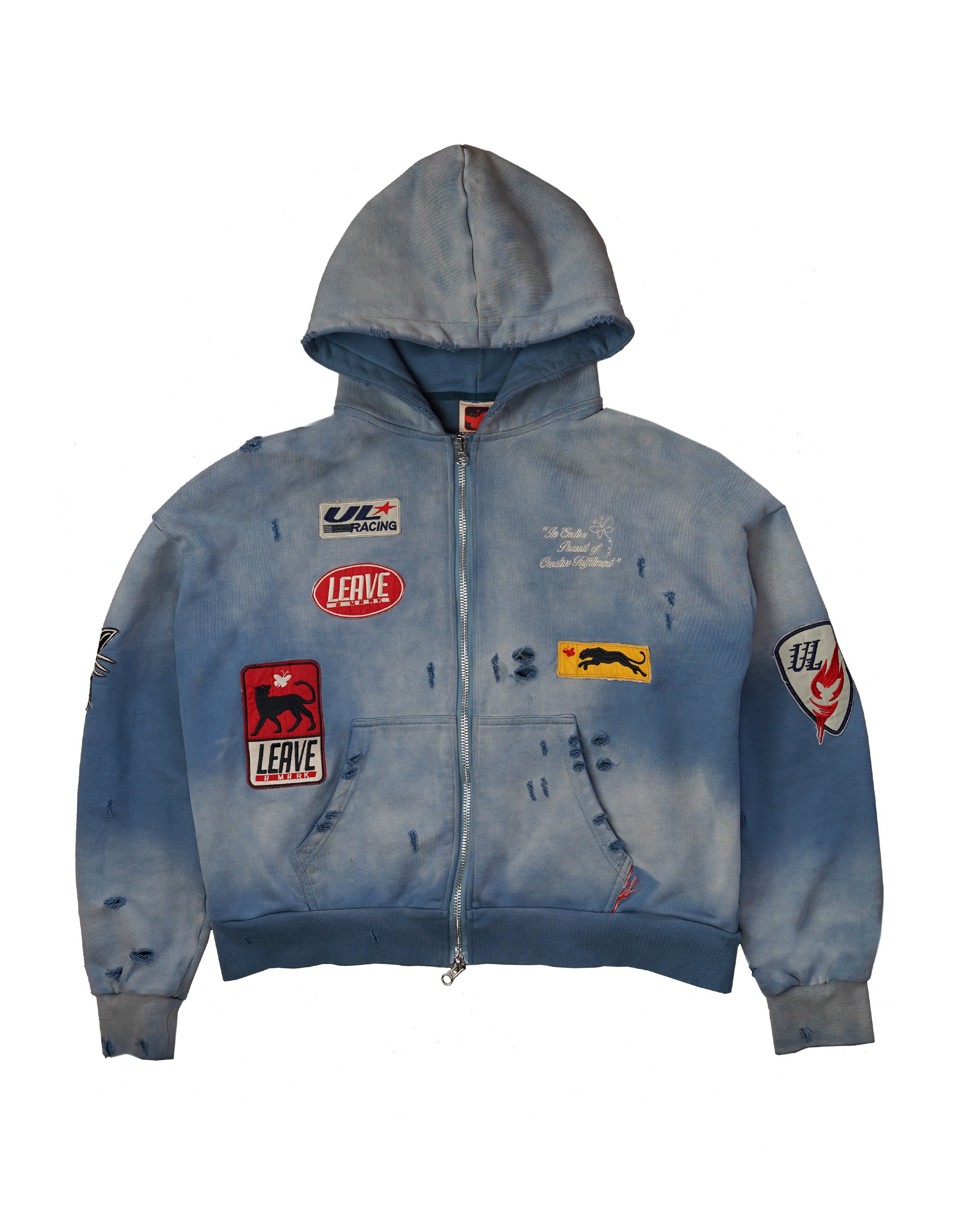 Product Detail: hooded sweatshirt in a heavy 20.4oz cotton Features an embroidered logo on the left chest and patchwork details.